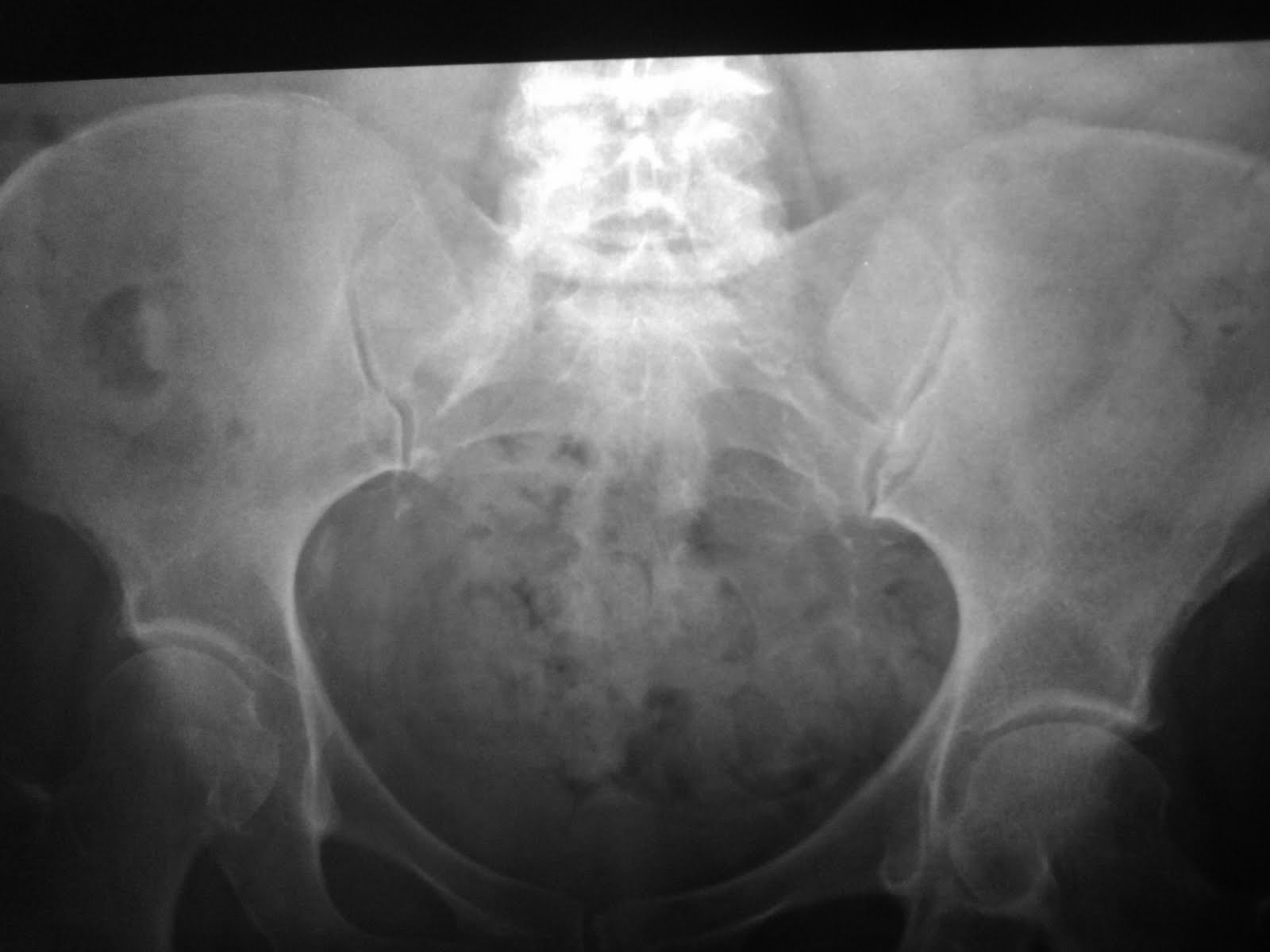 Ill defined sclerotic area on plain radiograph. The same region shows increased uptake on bone scan, and sclerotic deposit on coronal CT.